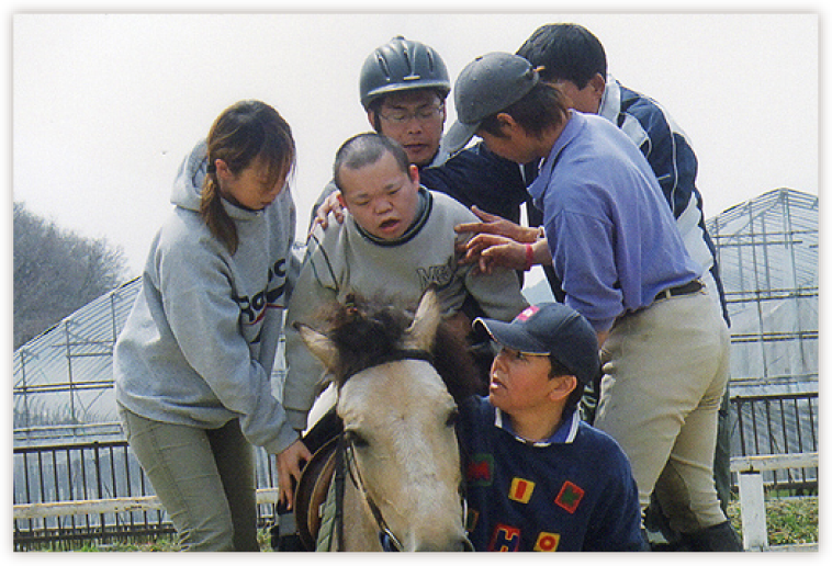 障がい者の方は、身体を動かす機会が少ないと感じています。「障がい者のある方」にとっての乗馬は、単に気晴らしや遊びとしてではなく、本来その方が持っている身体機能の回復や精神的な成長発達を促す効果を持っています。馬の上でバランスを取ることによって、リハビリとしての効果や、馬に乗ったり触ったりすることで自信にもつながっていきます。
