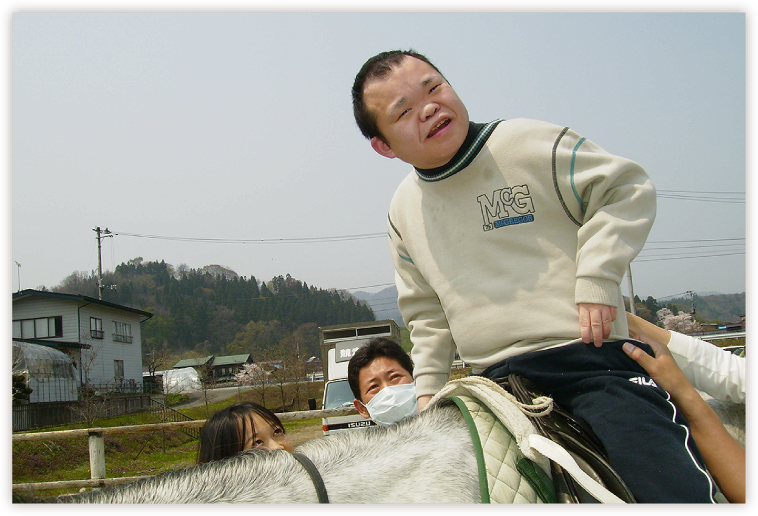 普段、生活の中では、あまり表情をかえることなく、笑うことの少なかった利用者さんが馬に乗った途端。満面の笑顔を見せてくれたり、脳性麻痺でまったく座位が取れず抱えられ乗っていた方が、2年の乗馬療法によって今では一人で馬に乗れるようになった…など、様々な効果を上げています。